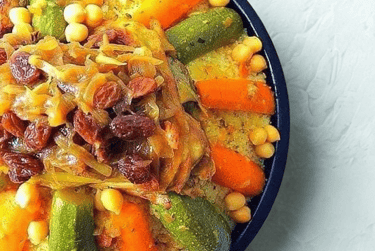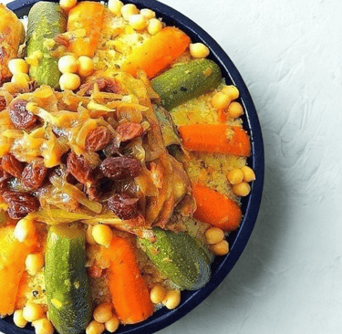 Notre couscous cuisiné avec des Légumes frais: carottes, courgettes, navets, choux, potiron, tomates et oignons. Servi avec des pois chiche, raisins secs et oignons caramélisées et de la harissa maison.et de la semoule de qualité supérieur cuite à la vapeur.